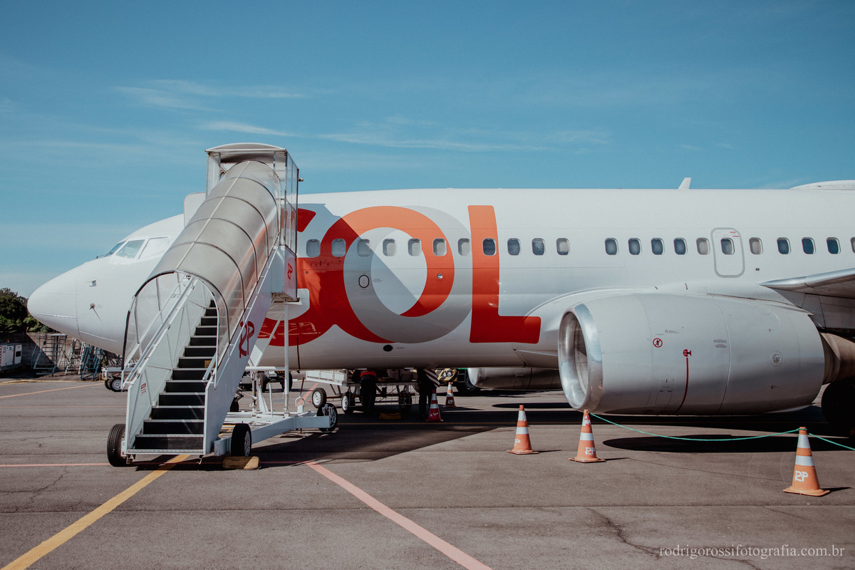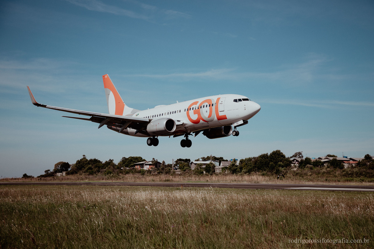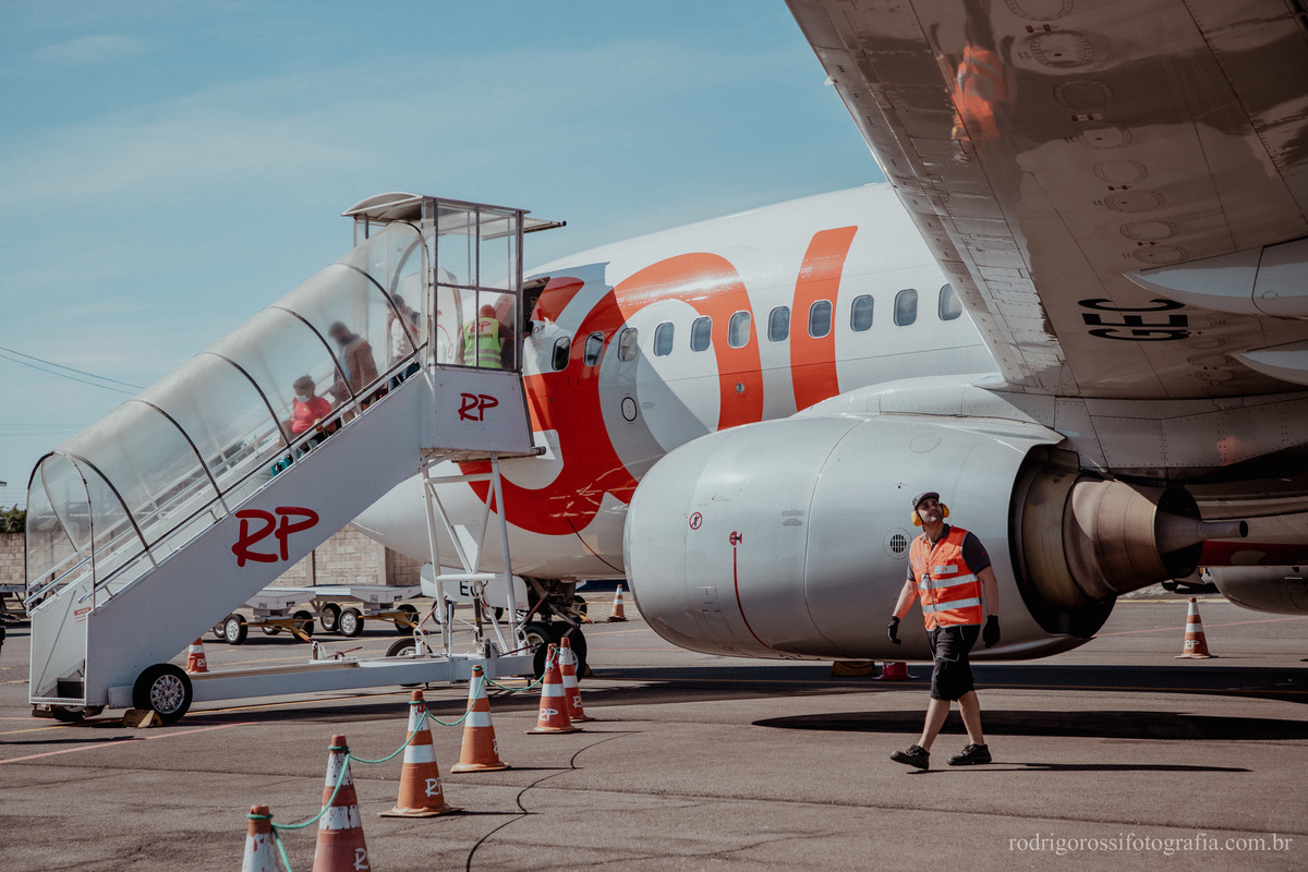 Pouso e decolagem do Boeing da Gol Linhas Aéreas, além de movimentação de embarque e desembarque de passageiros.