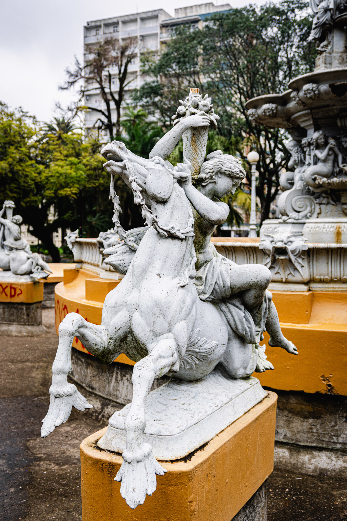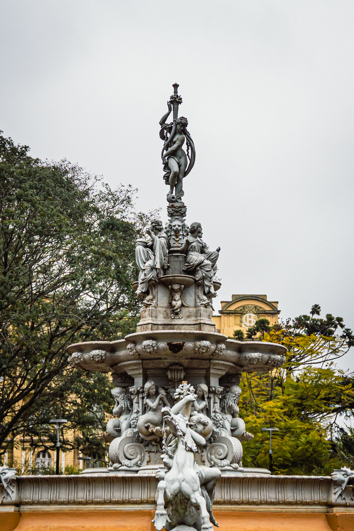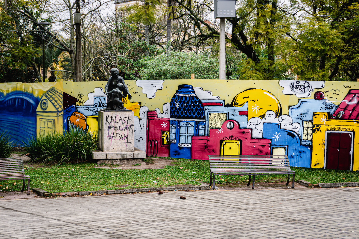 Aqui, um hiato. Com somente um dia livre para visitação, foi pouco o que deu para ver. Saímos somente no sábado, que começou com clima frio, chuvisco e nevoeiro, mas terminou com céu entre nuvens e sol. Fomos até a Praça Coronel Pedro Osório, que concentrava comércio de rua, um chafariz bonito e um pequeno prédio abandonado, cuja utilidade cheguei a pesquisar, mas não encontrei indicações sobre ele. Se você souber o que é, me avise nos comentários! O prédio em questão parecia um pequeno mausoléu e é rodeado por um lago artificial (com tartarugas pequenas ou cágados?). O chafariz da praça contém uma história bem mais interessante: nomeado 'As Nereidas', o chafariz foi importado da França pela Companhia Hidráulica Pelotense e instalado em 1873. Antes disso, naquele mesmo local, ficava o pelourinho, que era o local em que negros escravizados recebiam chibatadas públicas motivadas por infrações a eles atribuídas. A praça foi erguida em 1832 justamente para essa finalidade. Um legado trágico da nossa história, mas que jamais devamos esquecer.