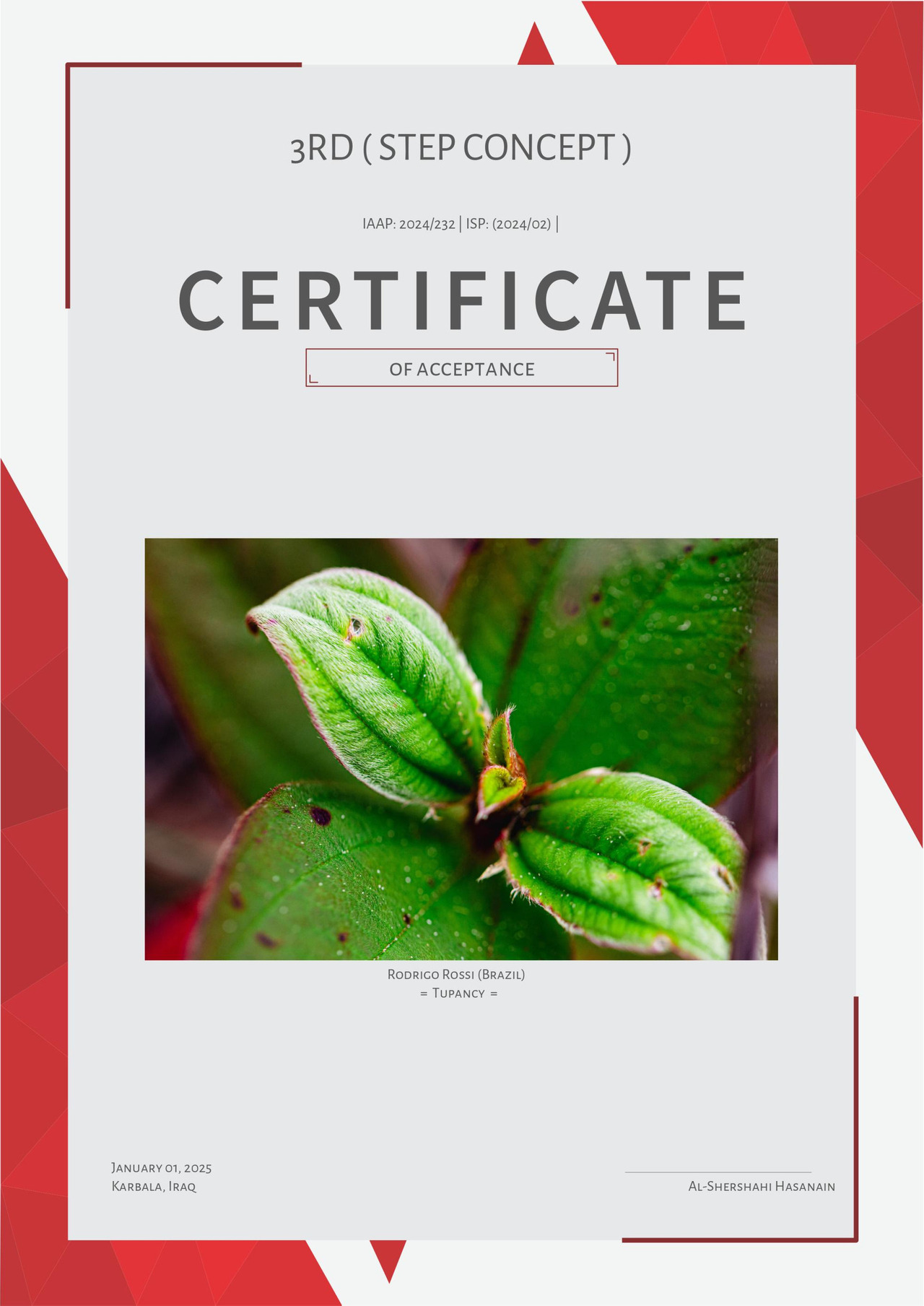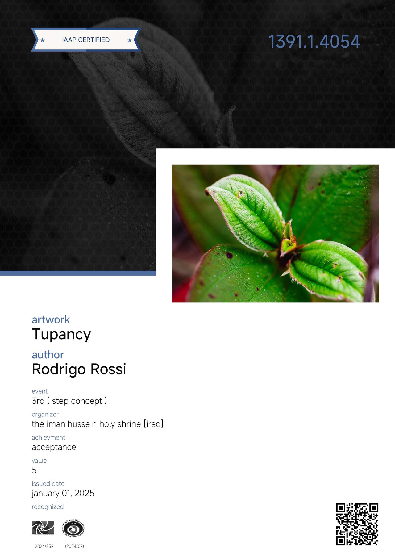 Desta vez, a premiação é internacional. No início do ano, classifiquei uma fotografia de uma planta, que fotografei na cidade de Torres (RS), a qual nomeei como "Tupancy". A fotografia recebeu Certificado de Aceitação no 3º Salão Internacional do Santuário Santo Imam Hussein, em Karbala, no Iraque.