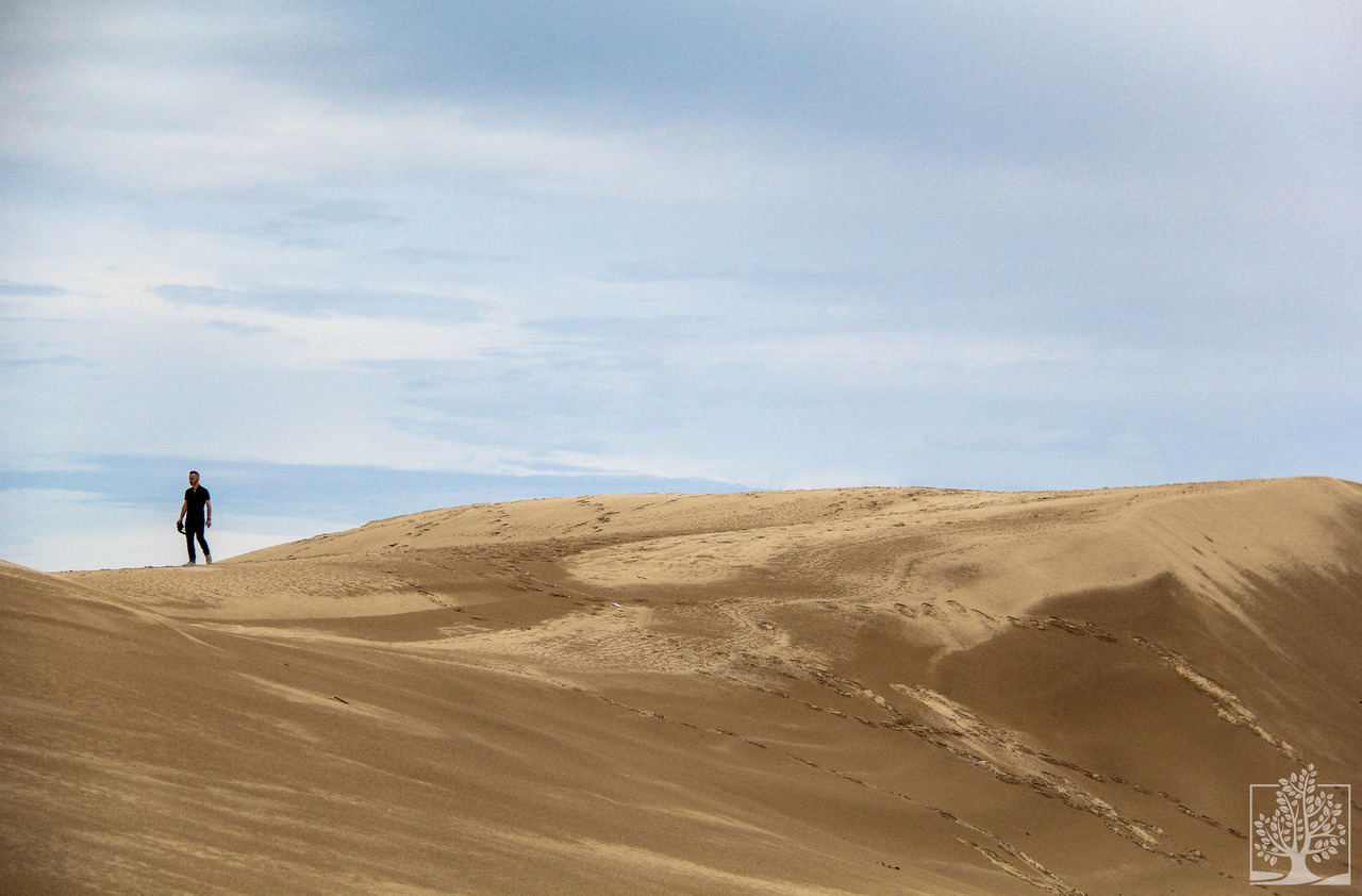 Desta vez, a fotografia mostra um homem - que agora eu não recordo seu nome, mas é um dos sócios do #CFCX - caminhando sob dunas de areia na área litorânea do município de Torres (RS). Rastros de pegadas de outras pessoas estão pluralizados pelo espaço, que têm ao fundo um céu claro e sereno. A fotografia foi capturada dentro das dependências do Parque Natural Tupancy.
